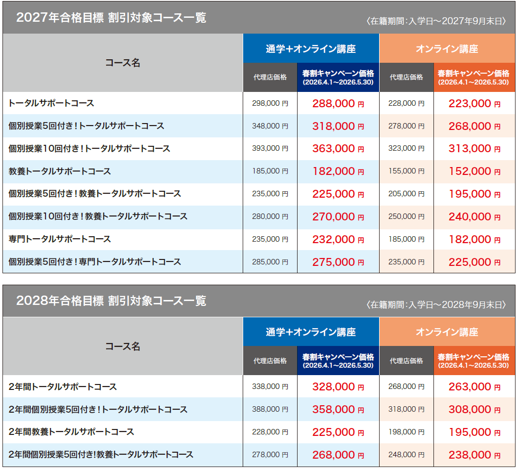 上記期限内にご入学頂くと、受講料がなんと、大学生協代理店割引価格から最大30,000円OFFとなります!